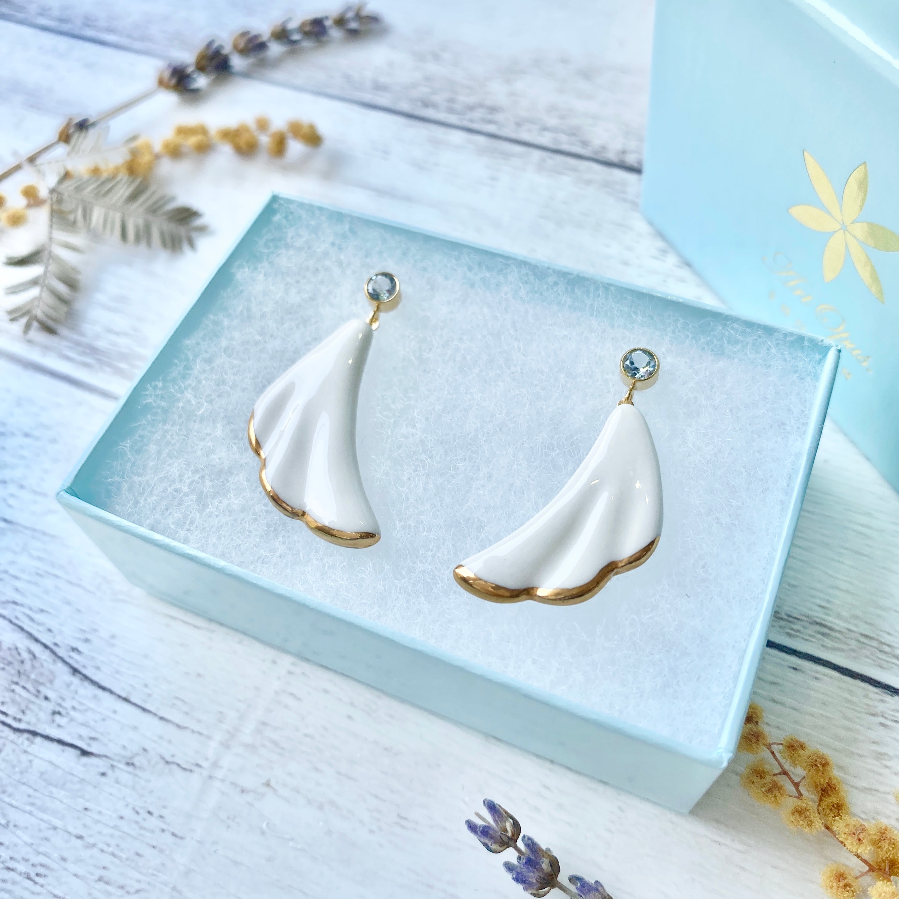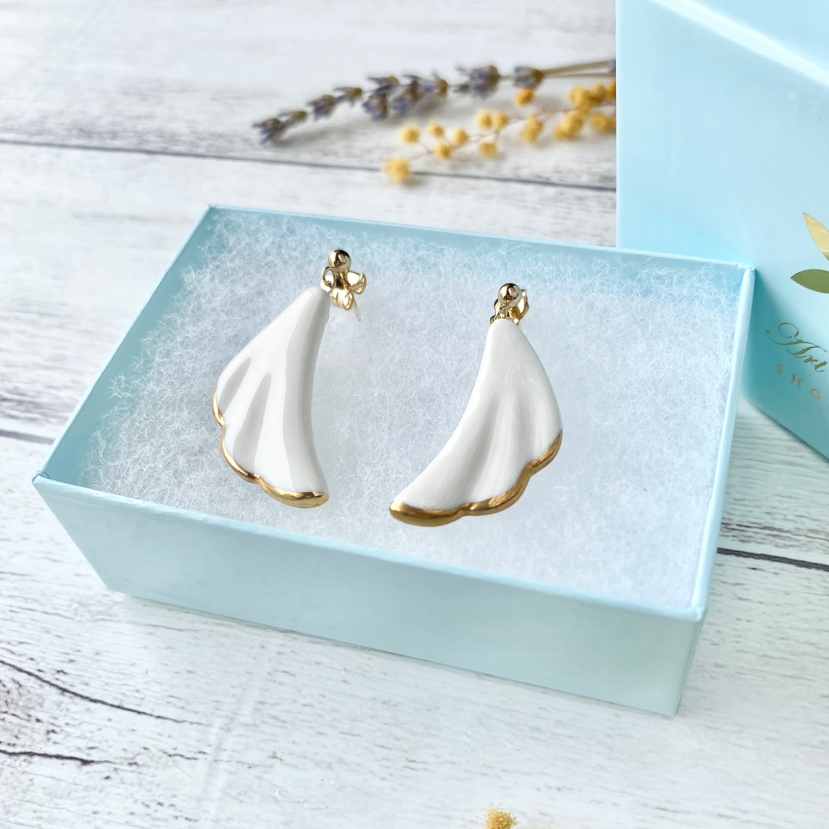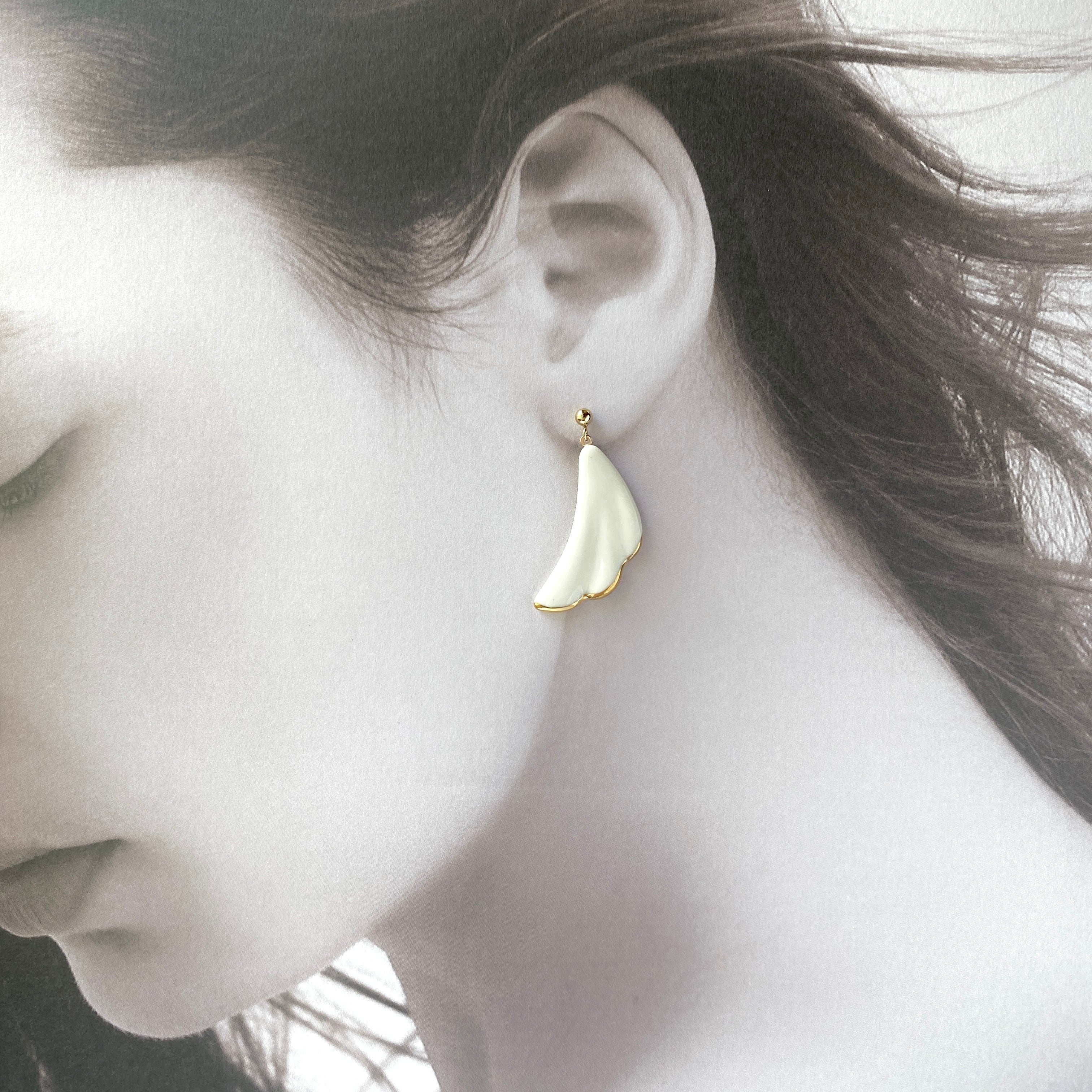 This design is inspired by angel wings. Angels, often depicted as children with wings, have long been seen as symbols of purity that connect heaven and earth.While we may easily forget the innocence of childhood, these angel wings were designed as a motif that gently reminds us of what is truly important and watches over us. It is our hope that those who wear this piece will feel a sense of lightness—like wings catching a gentle breeze and soaring freely through the sky.
